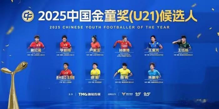2025中国金童奖(U21)候选人名单正式公布,蒯纪闻、李新翔、卢家玉、孙康博、王爱芳、王钰栋、吾米提江·玉苏普、徐彬、杨希、朱鹏宇十位U21球员成功入围,名单按拼音字母顺序排列,涵盖男女足各位置新星,彰显中国足球新生代的发展活力。